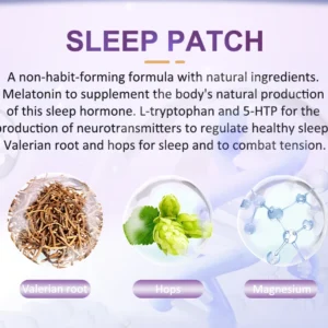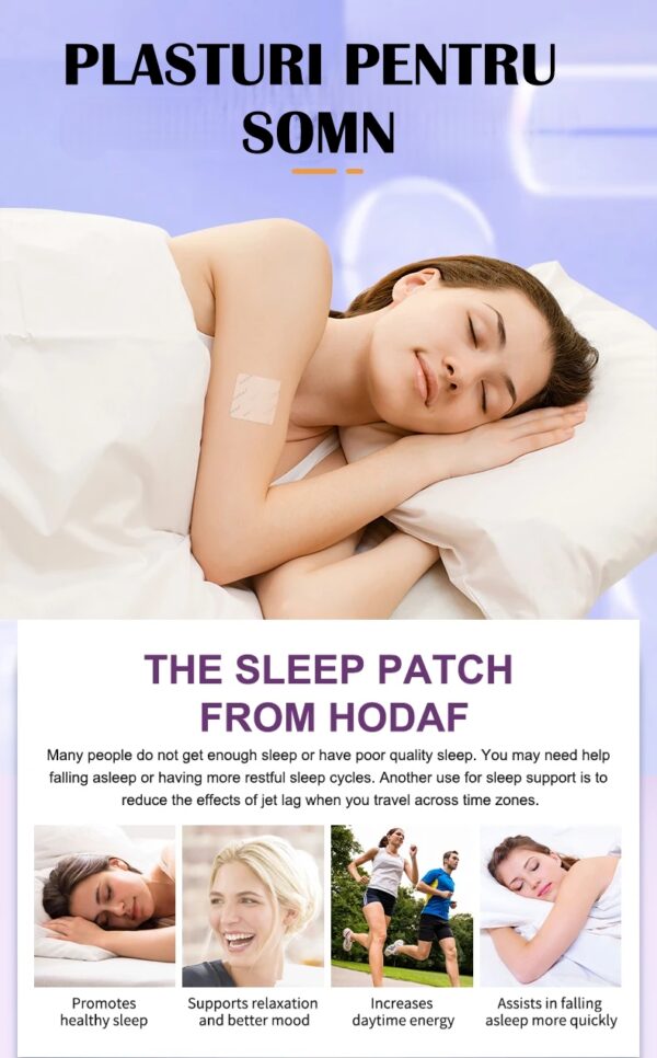 Acesti plasturi sunt conceputi pentru a promova somnul sănătos impotriva obiceiurilor nesanatoase da a sta treaz pana tarziu in noapte. Acestea conțin ingrediente naturale, uleiuri esentiale cum ar fi melatonina, L-triptofanul, 5-HTP și rădăcina valeriană, care ajută la reglarea ciclurilor de somn și la îmbunătățirea calității somnului. Plasturii sunt ușor de utilizat, se aplică pur și simplu pe o zonă fără păr a pielii, pentru o absorbție optimă. Acestea ajută la adormirea mai rapidă, sporesc relaxarea și crește energia din timpul zilei. Fiecare plasture este eficient timp de până la 8 ore și nu contine latex, lactoză, gluten și zahăr.